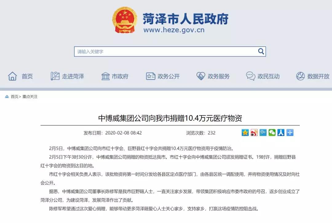 中博威集团公司董事长陈修军表示,病毒无情,人间有爱,通过我们中博威集团公司这次爱心捐赠,能够带动更多菏泽籍爱心人士关心家乡,支持家乡,汇集成抗击病毒的强大社会力量,万众一心,抗击病毒,众志成城,共克时艰,我们相信党,相信国家,相信市委市政府,我们一定能够打赢这场疫情防控阻击战。